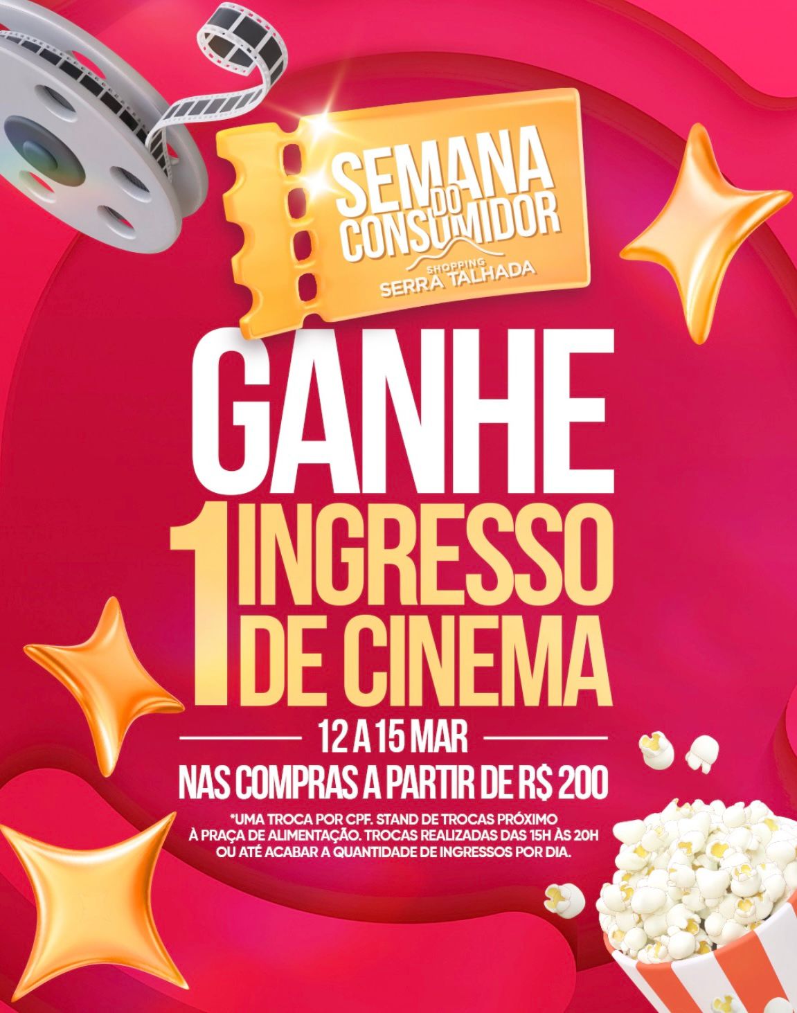 A cada R$200 em compras, você ganha 1 ingresso de cinema para curtir aquele filminho no Cine A.
